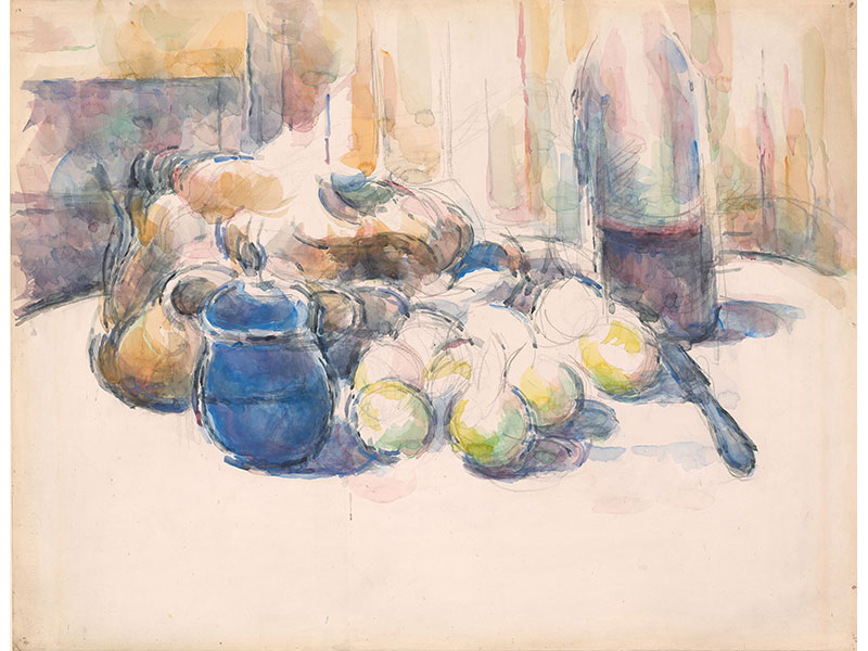Still Life with Pears and Apples, Covered Blue Jar, and a Bottle of Wine