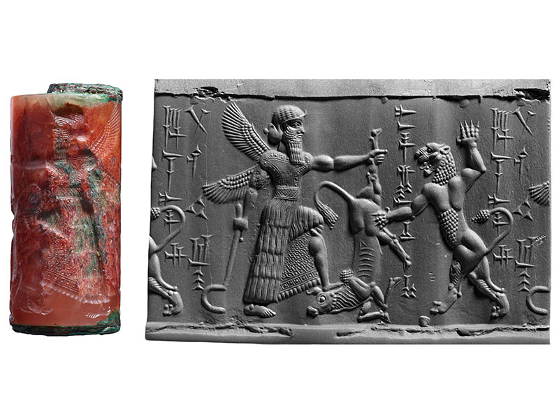Winged hero with scimitar, bull, and lion